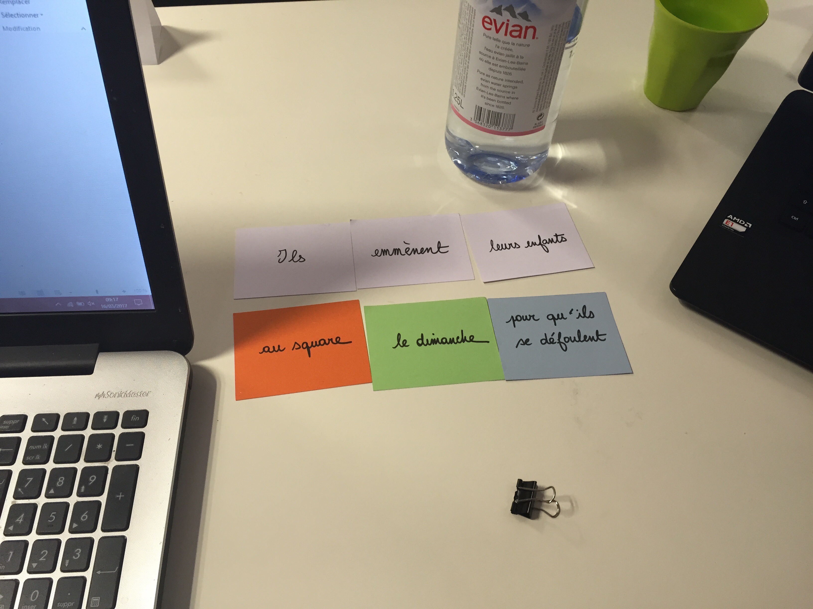 La notion abordée ici porte sur les majuscules. Comme exercice d’application, le choix du texte à trous a été retenu, afin que chacun place les différents Post-it à l’endroit approprié pour compléter le texte et raturer la mauvaise orthographe.
